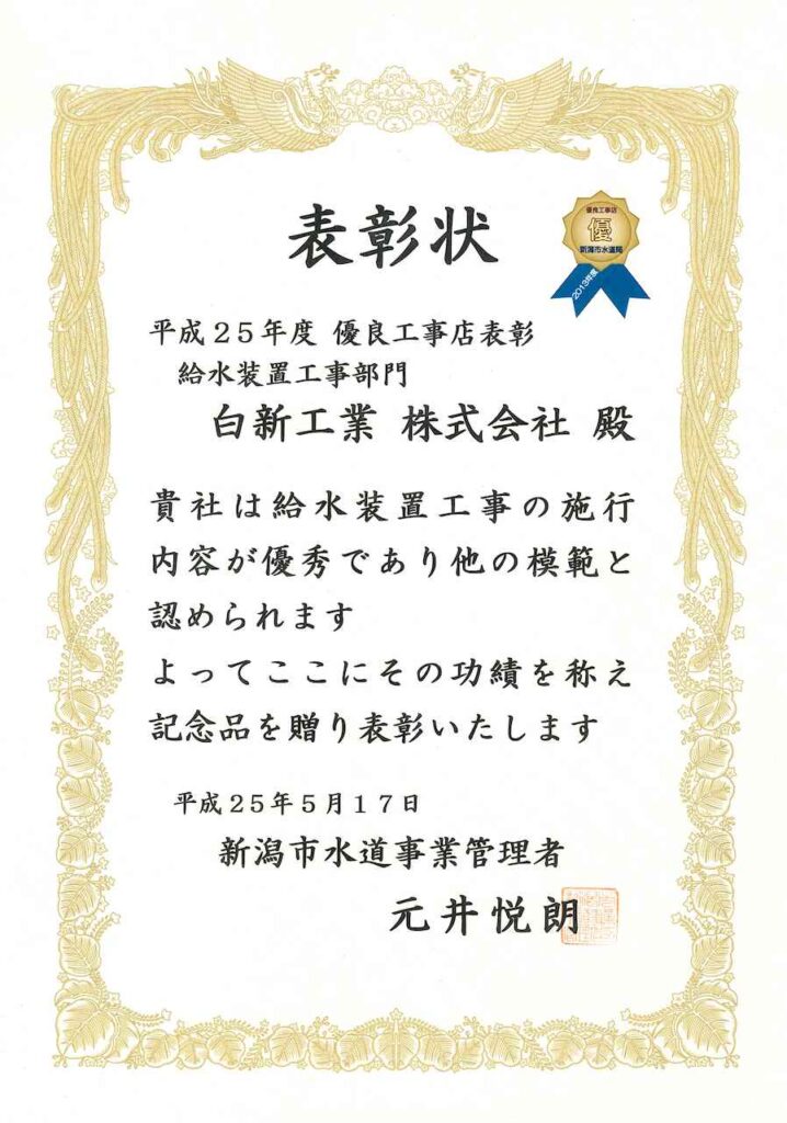 「平成25年度 水道局優良工事店表彰 給水装置工事部門」を受賞いたしました 2026 2/14 お知らせ お知らせ 「平成27年度 水道局優良工事店表彰 緊急修繕協力部門」を受賞いたしました 関連記事 「健康経営優良法人 2026(中小規模法人部門)」に認定されました 「新潟市健康経営認定制度」ゴールドクラスに認定されました 「新潟県多様で柔軟な働き方・女性活躍実践企業認定制度『Ni – ful』」ゴールド認定されました 一般事業主行動計画を策定いたしました 「消防団協力事業所表示制度」に登録されました 「新潟県SDGs推進建設企業登録制度」に登録されました 「にいがた健康経営推進企業」に登録されました 「ハッピー・パートナー企業(新潟県男女共同参画推進企業)」に認定されました