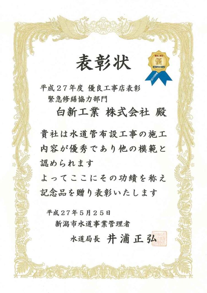 「平成27年度 水道局優良工事店表彰 緊急修繕協力部門」を受賞いたしました 2026 2/14 お知らせ お知らせ 「平成25年度 水道局優良工事店表彰 給水装置工事部門」を受賞いたしました 2020 新潟市某所 学校施設 関連記事 「健康経営優良法人 2026(中小規模法人部門)」に認定されました 「新潟市健康経営認定制度」ゴールドクラスに認定されました 「新潟県多様で柔軟な働き方・女性活躍実践企業認定制度『Ni – ful』」ゴールド認定されました 一般事業主行動計画を策定いたしました 「消防団協力事業所表示制度」に登録されました 「新潟県SDGs推進建設企業登録制度」に登録されました 「にいがた健康経営推進企業」に登録されました 「ハッピー・パートナー企業(新潟県男女共同参画推進企業)」に認定されました